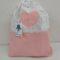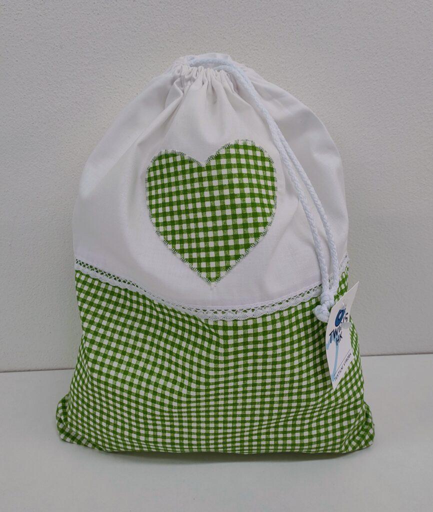 Velký textilní sešívaný sáček na potraviny zdobený srdíčkem a bavlněnou paličkovanou krajkou ,tkanice na stažení ,100% bavlna ,rozměr je 37x30x4cm.